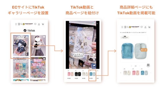 TikTok動画をTOPページや商品詳細ページ、ランディングページ(LP)など、サイト内の目的に合わせて自由に配置・活用することで、商品との新しい出会いを創出し、サイト回遊率およびコンバージョン率(CVR)の向上を実現します。