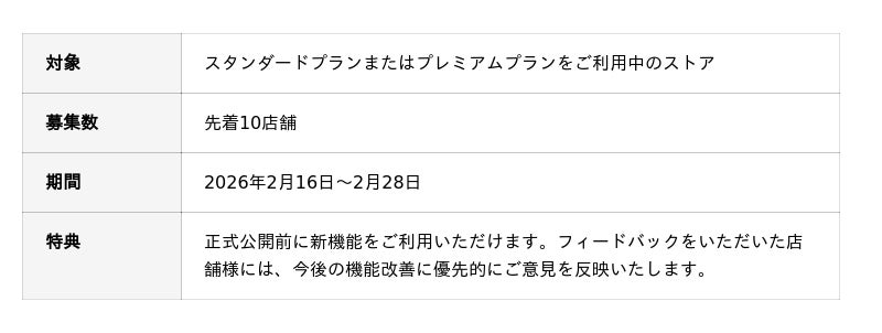本機能は現在、スタンダードプラン以上のストア様を対象に先行利用の申し込みを受け付けております。