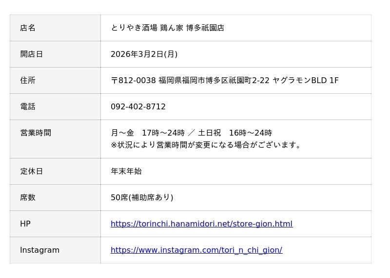 2026年3月2日(月)オープン とりやき酒場 鶏ん家 博多祇園店