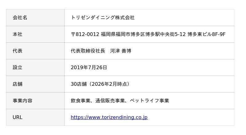 新鮮な鶏肉をスタッフが焼き上げるスタイルで人気の「とりやき酒場 鶏ん家(とりんち)」を展開する、トリゼンダイニング株式会社(本社:福岡市博多区/代表取締役社長:河津 善博)は、2026年2月20日に名古屋エリア2店舗目となる「名古屋栄住吉店」を、続く3月2日には福岡エリア4店舗目となる「博多祇園店」をオープン、さらに札幌エリアでは初の「札幌店」を6月にオープン予定です。