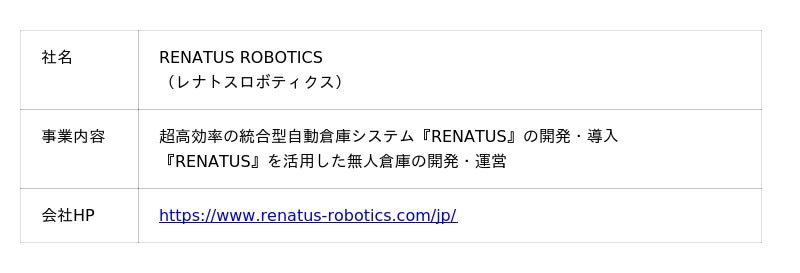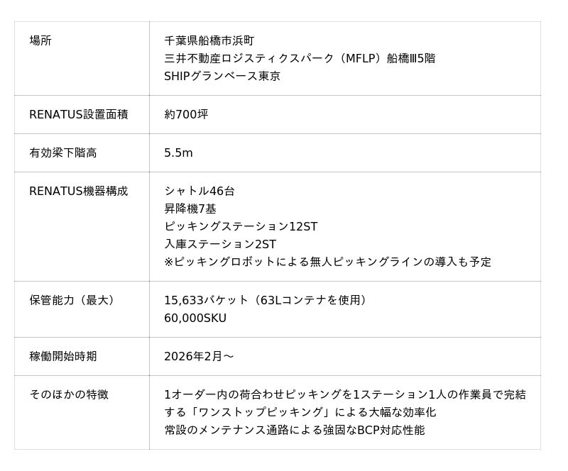 RENATUS ROBOTICS(レナトスロボティクス)は株式会社エフエスユニマネジメント(本社:東京都港区、以下「FSM」)のSHIPグランベース 東京へ統合型自動倉庫システム「RENATUS」の導入が完了し、2026年2月より本稼働を開始することを公表した。