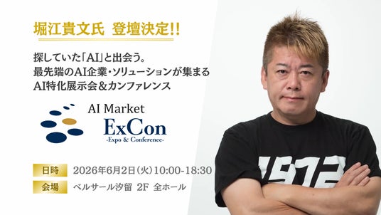 AI導入を本格検討する企業が一堂に会し、最新のAIビジネス動向と実践事例をリアルに体感できる6月2日開催のイベント「AI Market ExCon」へ、堀江貴文氏の登壇が決定致しました。