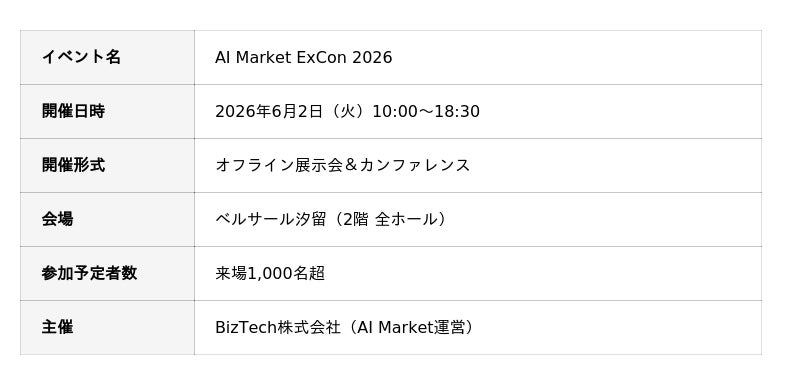 本イベント「AI Market ExCon 2026」は、そうした大型・好評イベントで培ってきた来場者設計・運営ノウハウ・企業ネットワークを背景に、本格オフライン展示会×カンファレンスとして開催するものです。