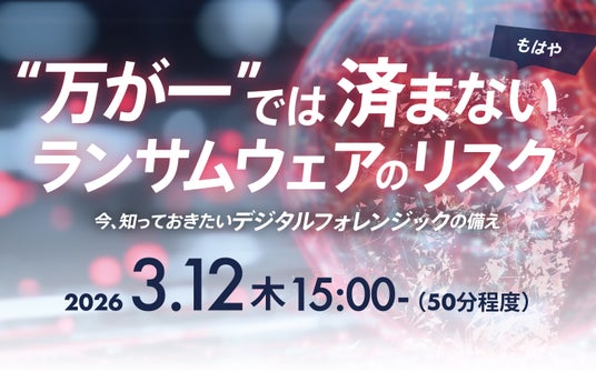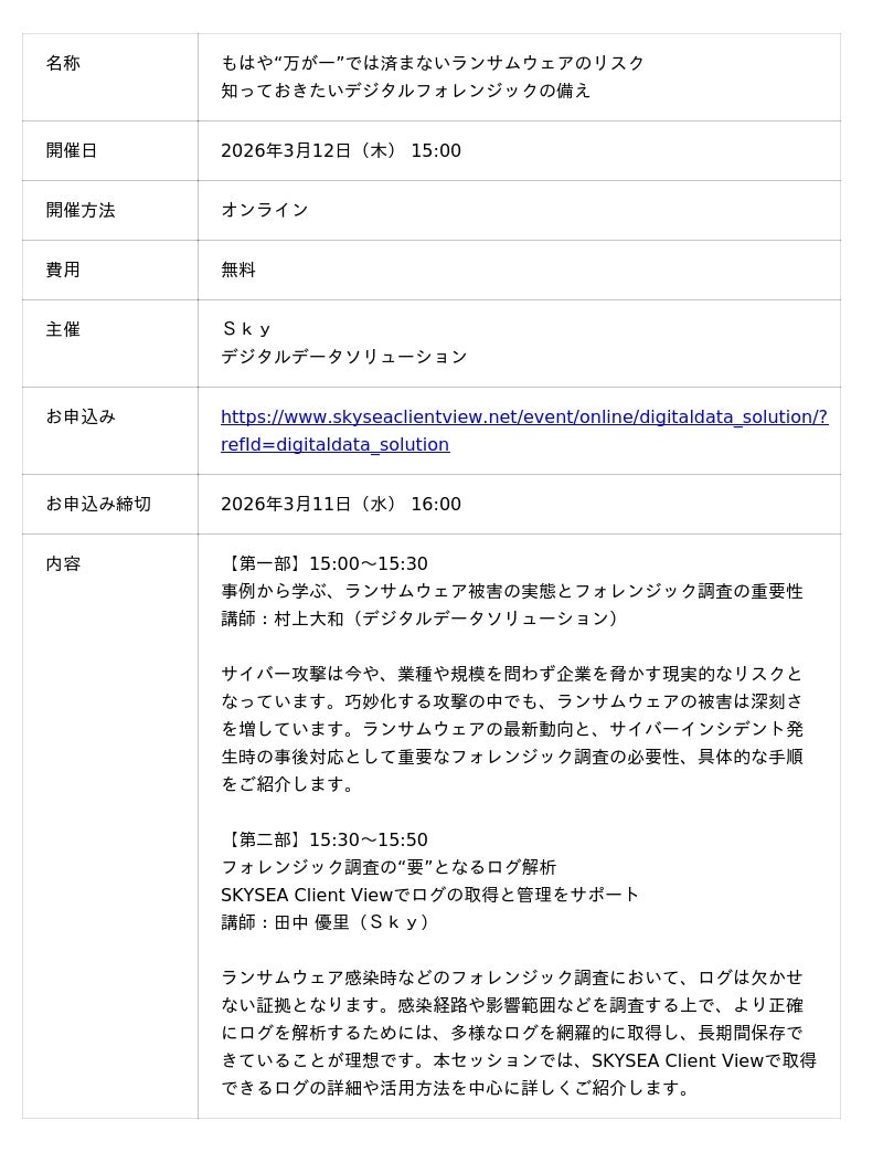 デジタルデータソリューション株式会社(本社:東京都港区六本木ヒルズ森タワー、代表取締役社長:熊谷 聖司、以下デジタルデータソリューション)とSky株式会社(東京本社:東京都港区、大阪本社:大阪市、代表取締役:大浦 淳司、以下Sky)は、2026年3月12日(木)にサイバーインシデント事後対応セミナー「もはや万が一では済まないランサムウェアのリスク 知っておきたいデジタルフォレンジックの備え」を開催します。