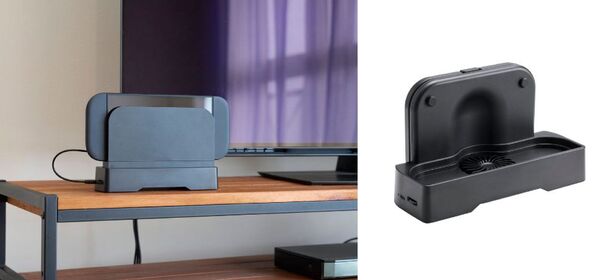 Nintendo Switch 2用の冷却ファンスタンドは、ドック底面から効率的に風を送り、テレビモード中の機器温度を抑えることができる。設置方法は縦置き、横置き(4段階の角度調節可能)に対応し、特に横置きだと高さ約10cmでテレビ台の棚にすっきり収まる。風量調節スイッチにより、好みに応じて風の強さも無段階で調節可能だ。