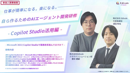 株式会社Edivule(本社:東京都杉並区、代表取締役:浦田 隼佑)は、Microsoft 365環境でAIエージェントを自ら開発するためのオンラインセミナー「自ら作るためのAIエージェント開発研修 - Copilot Studio活用編 -」を2026年3月に開催いたします。