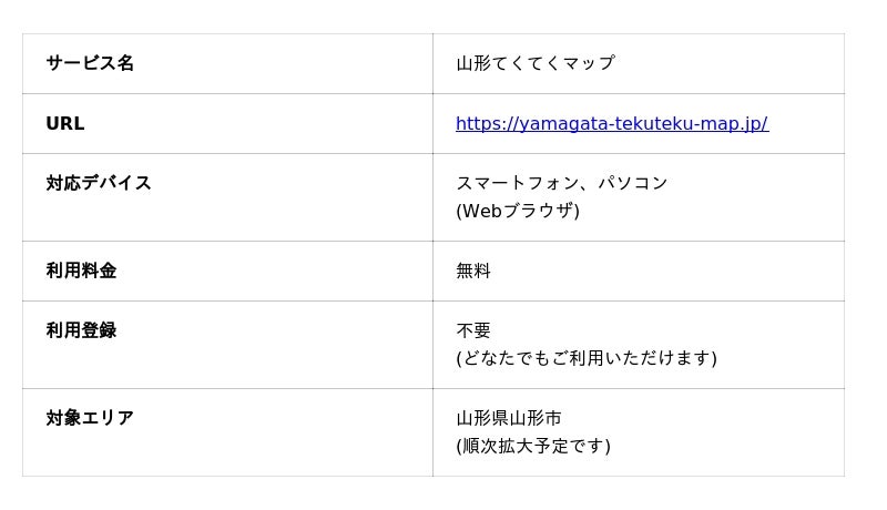 山形てくてくマップは、無料のWebサービスです。ユーザー登録はせず、店舗の検索・閲覧・口コミの投稿など、すべて無料で利用できます。
