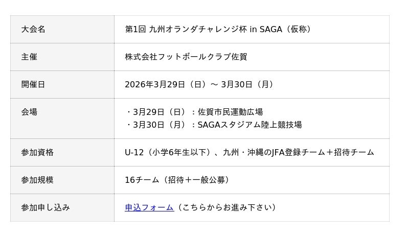 2026年3月29日(日)・30日(月)の2日間、株式会社フットボールクラブ佐賀は、オランダのMVV Maastricht Football HUBと連携し、U-12年代を対象とした国際育成連携大会 「第1回 九州オランダチャレンジ杯 in SAGA」(仮称) を開催いたします。
