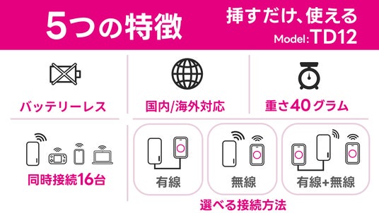 契約・返却・月額費用が一切不要な「リチャージモバイル」から、リチャージWiFiシリーズの最新モデル、車載利用にも最適なバッテリーレス仕様の「TD12」を発売いたします。