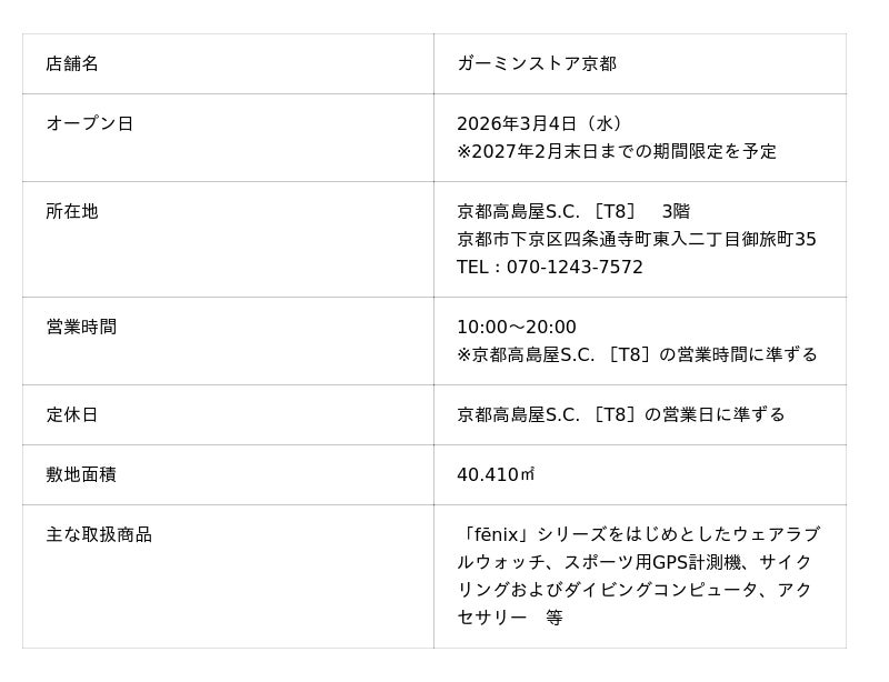 アメリカ発データ活用のプロフェッショナル、ガーミンジャパン株式会社(以下、Garmin)は、京都四条河原町の老舗百貨店「京都高島屋S.C.」の専門ゾーン[T8]に、ブランド直営店「ガーミンストア京都」(京都市下京区四条通寺町東入二丁目御旅町35 [T8]3階)を、2026年3月4日(水)にオープンします。