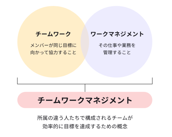 チームワークマネジメントとは? 多様なメンバーが共通の目的達成のために助け合い、自律的に動けるチームを設計・運営する概念。チームの構造を見える化し、コミュニケーションを設計することで、チームメンバーが個々の能力を発揮しやすくし、全体の生産性向上と目標達成を目指す。