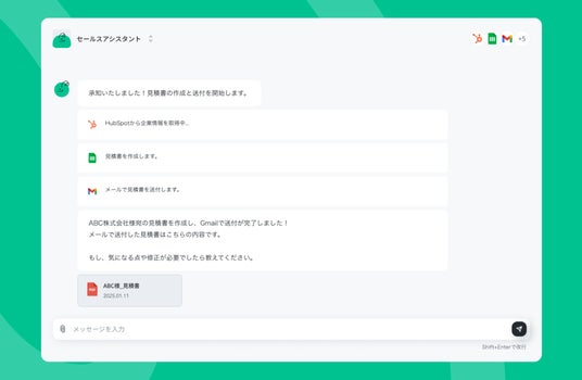 見積書や契約書などの書類を作成し、作成した書類をメールや電子契約ツールなどで自動的に送信します。また、商談前の企業リサーチや、商談後の議事録作成・CRMの更新など、営業活動に付随する事務作業を幅広く自動化します。