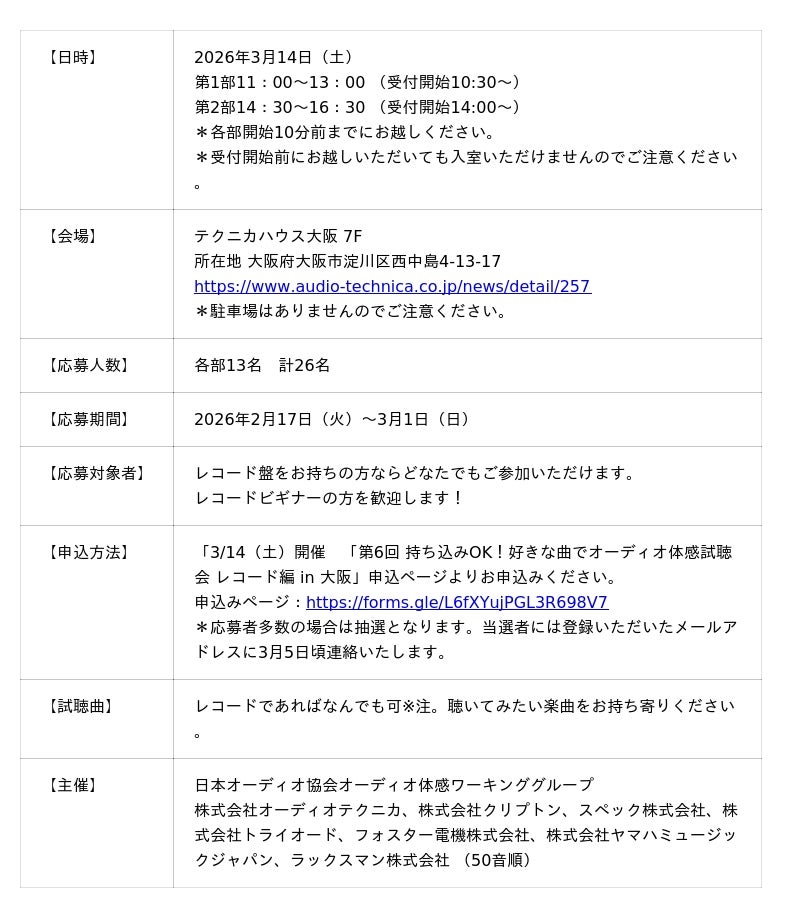 一般社団法人日本オーディオ協会(所在地:東京都港区、会長:小川理子)は、好評を博している体験型イベント「持ち込みOK!好きな曲でオーディオ体感試聴会」を、2026年3月14日(土)、大阪にて開催いたします。