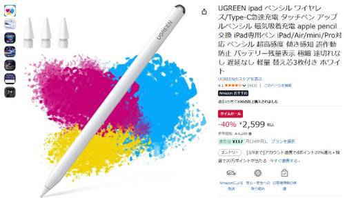 UGREENのiPad用タッチペンがタイムセール対象。参考価格4,299円のところ、40%オフの2,599円で販売中。