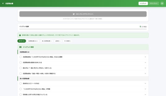 志望理由書作成に必要な知識、考え方、注意点をチェックリスト形式で学習。