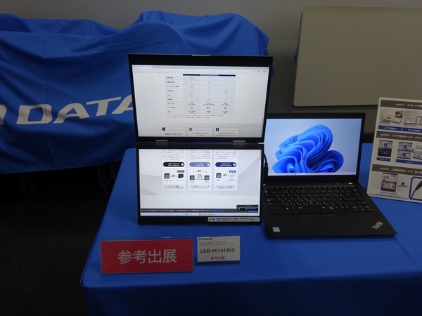 記者説明会場には、フルHD解像度の14型デュアル(2画面)モバイルディスプレー「LCD-YC1412DX)も展示されていた。上下開き、左右開き、対面開きで表示でき、3つの表示モードを本体のボタンで切り替えられる
