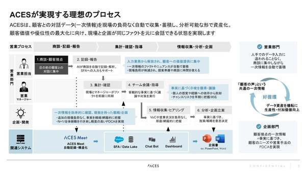 同ソリューションは音声認識・構造化技術を用いた「ACES Meet」や、企業のDXをAIソリューションで支援してきた同社の知見を活かし開発。商談の自動記録から文脈を含んだ分析、組織への定着までを支援することで、現場と企画の情報の断絶を解消し、意思決定の質とスピードの向上を図るという。
