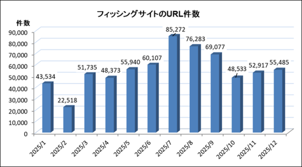 フィッシングメール/SMSの誘導先(偽Webサイト)にあたる「URL件数(重複なし)」は前月から2568件増えて、5万5485件となりました。