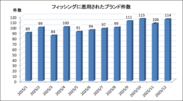 また悪用された「ブランド件数」は前月から8ブランド増えて114件でした。内訳はクレジット・信販系24ブランド、金融(銀行)系17ブランド、証券系12ブランド、通信事業者・メールサービス系11ブランド、EC系9ブランド、オンラインサービス系8ブランドとなっています。