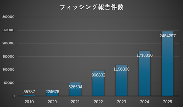 なお、2025年全体のフィッシング報告件数は245万4297件で、昨年(171万8036件)から73万6261件増加しました。200万件を超えたのは初めてのことで、6年前と比べると約44倍にまで膨れ上がりました。