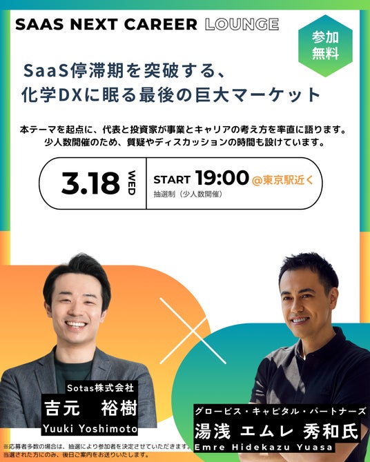 当日は、Sotas代表の吉元より今後のビジョンや事業展望についてお話しします。また、本調達のリード投資家であるグロービス・キャピタル・パートナーズの湯浅 エムレ 秀和氏にもご登壇いただき、今回の資金調達に至った背景やSotasに期待するポイントなどをお話しいただく予定です。