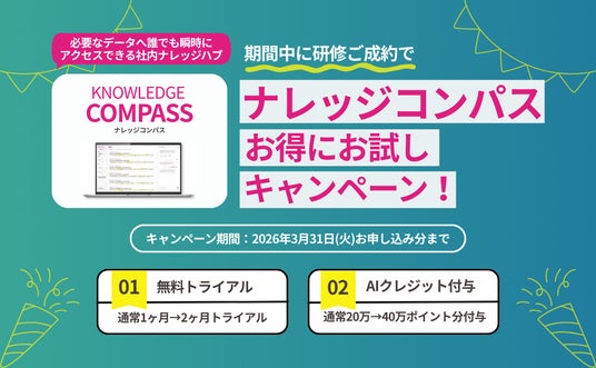 アポロ株式会社(本社:東京都渋谷区、代表取締役社長:宮地謙輔、以下アポロ)は、企業の組織力強化を支援するため、実践型企業向け研修をご成約いただいた企業様を対象に、社内ナレッジハブツール「KNOWLEDGE COMPASS(ナレッジコンパス)」を特別条件で提供するキャンペーンを2026年2月18日(水)より開始いたします。
