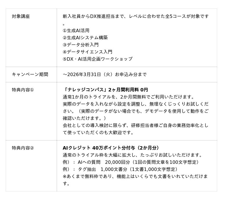 本キャンペーンは、新年度、DXやAI活用に踏み出したい企業様にとって最大の壁となる「導入コスト」と「実用性への不安」を解消するために企画されました。