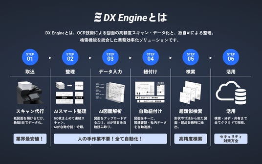 DX Engineは、OCR技術による書類・図面の高精度なスキャン・データ化と、独自AIによる整理・検索機能を統合した、業務効率化ソリューションです。製造業を中心に、大手自動車部品や大手工作機械メーカー、加工会社などで導入が進んでいます。