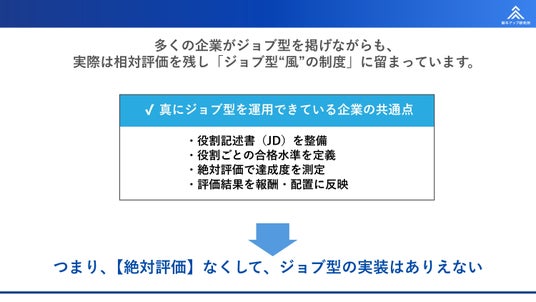 つまり、【絶対評価】なくして、ジョブ型の実装はありえないというのが本セミナーの出発点です。
