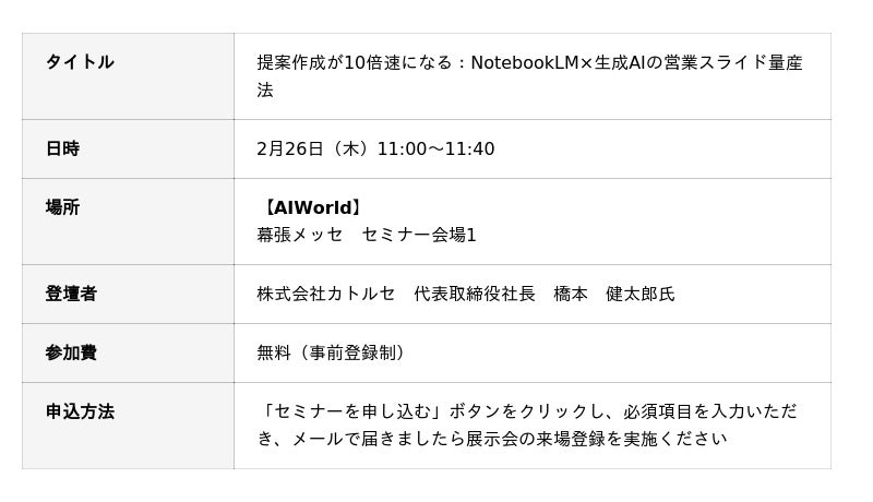 【2/26(木)展示会セミナー登壇】提案作成が10倍速になる:NotebookLM×生成AIの営業スライド量産法