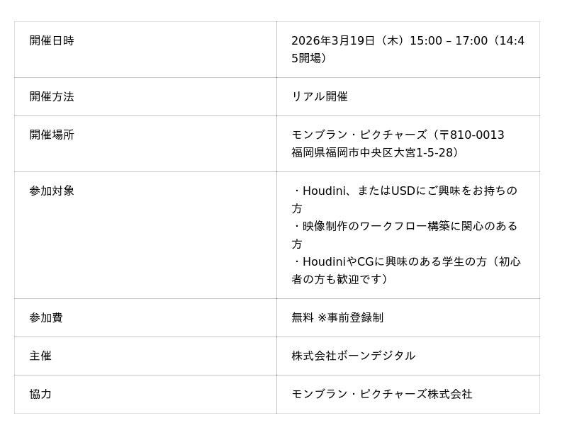 株式会社ボーンデジタル(本社:東京都千代田区、CEO:新 和也、URL:https://www.borndigital.co.jp/ )は、Houdiniを活用したUSDワークフローを紹介するセミナー「USD for Small Studios - Houdiniから始める「少人数・高効率」の制作ワークフロー -」を、2026年3月19日(木)に福岡にて開催いたします。