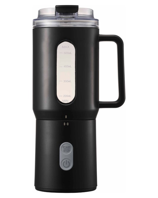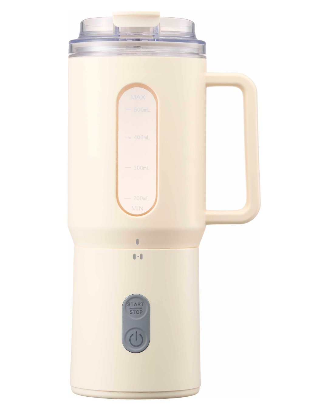 取っ手付きタンブラー型で、家の中はもちろん、外出先やオフィスにも気軽に持ち運びしやすいデザインです。また、モーター部分は本体下部に配置しているため、攪拌後は本体から取り外して下フタを取り付けることで、マグジョッキのように飲むことも可能です。