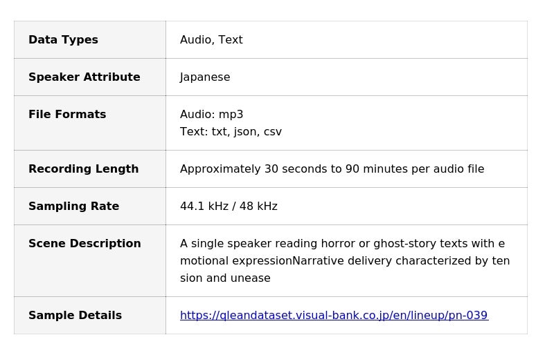 Qlean Dataset Launches Japanese Single-Speaker Horror Story Read-Aloud Speech Corpus with Transcripts