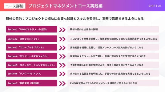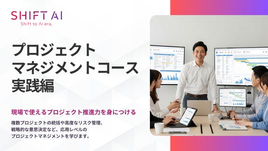 「日本をAI先進国に」を掲げ、AIのビジネス活用が学べる利用者数No.1※の生成AI学習コミュニティ「SHIFT AI」を運営する株式会社SHIFT AI(東京都渋谷区、代表取締役 木内翔大、以下当社)は、法人向けリスキリングサービス「SHIFT AI for Biz」のeラーニングプラットフォームにて、「プロジェクトマネジメントコース実践編」を2026年2月18日より提供開始します。本コースは、プロジェクトマネジメントに必要な基礎知識をはじめ、リスク対応、プロジェクト評価まで、実際の現場を想定した演習を通じて学べるe-learningプログラムです。受講者は、組織内のプロジェクトを効率的に推進するための実践的な判断力・マネジメントスキルを体系的に習得することができます。