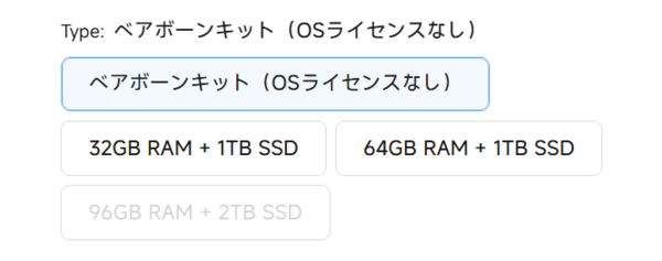 さらに嬉しいのが「ベアボーンキット(OSライセンスなし)」の存在。メモリーやSSDを自分で選んで安く済ませたい人や、手持ちのパーツを使い回したい人なら、完成品よりずっとお得にゲットできます。