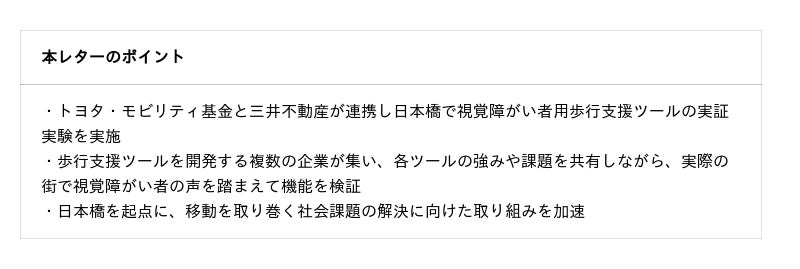本実証実験は「Mobility for ALL 心も動く移動を、すべての人に。」を掲げるトヨタ・モビリティ基金が主催者として企画・推進し、街づくりを通じ、日本橋を把握している三井不動産が、検証設計や実証環境の整備に協力しました。これにより、技術単体の性能評価にとどまらず、利用シーンを踏まえた検証を行うことができました。