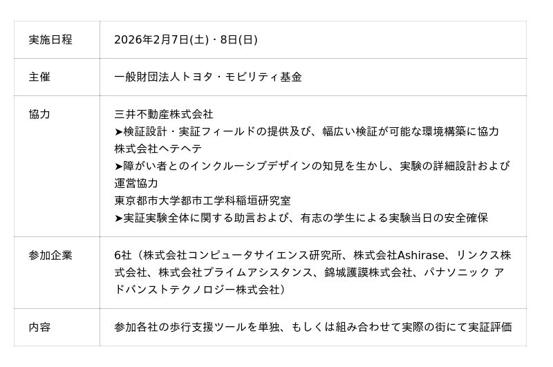 三井不動産株式会社(本社:東京都中央区 代表取締役社長:植田俊、以下「三井不動産」)と、一般財団法人トヨタ・モビリティ基金(本社:東京都文京区 理事長:豊田章男、以下「トヨタ・モビリティ基金」)は、2026年2月7日・8日に、日本橋エリアにおいて、視覚障がい者用歩行支援ツールの実証実験(ワクワクプロジェクト)を実施しました。