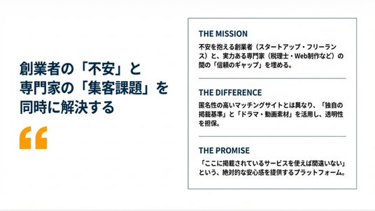といった課題を解決するために構想された、創業支援に特化したマッチング型プラットフォームです。