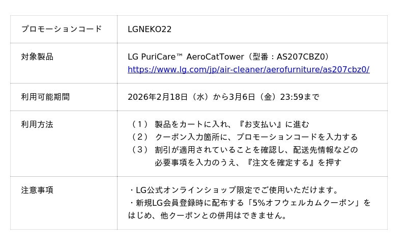 LGエレクトロニクス・ジャパン株式会社(代表取締役:孫 成周(ソン・ソンジュウ)、本社:東京都中央区)は、2月22日(日)の猫の日を記念して、本日2026年2月18日(水)から3月6日(金)までの期間、LG公式オンラインショップ限定で「LG PuriCare(TM) AeroCatTower」が22%オフとなる『にゃんにゃんクーポン』を配布します。さらに、本クーポンで「LG PuriCare(TM) AeroCatTower」を購入いただいた方には、もれなくアレル物質特化型プレフィルター1枚をプレゼントします。(※1)