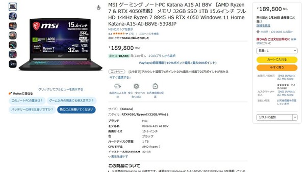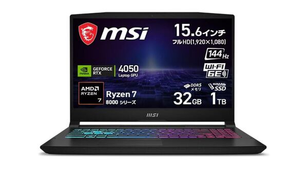 Amazon.co.jpにて、MSIの15.6型ゲーミングノートPC「Katana A15 AI B8V【AMD Ryzen 7 & RTX 4050搭載】」が販売中だ。価格は18万9800円。
