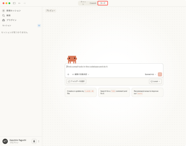 Codeは開発向けのモードだ。ターミナルを使った処理を実行でき、ソースコードの編集、ライブラリの追加、依存関係のインストール、ビルドやテストの実行まで指示できる。単にコード例を出力するのではなく、実際にプロジェクトを操作する前提の設計になっている。