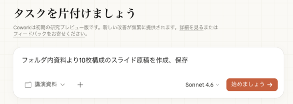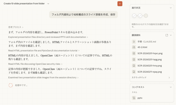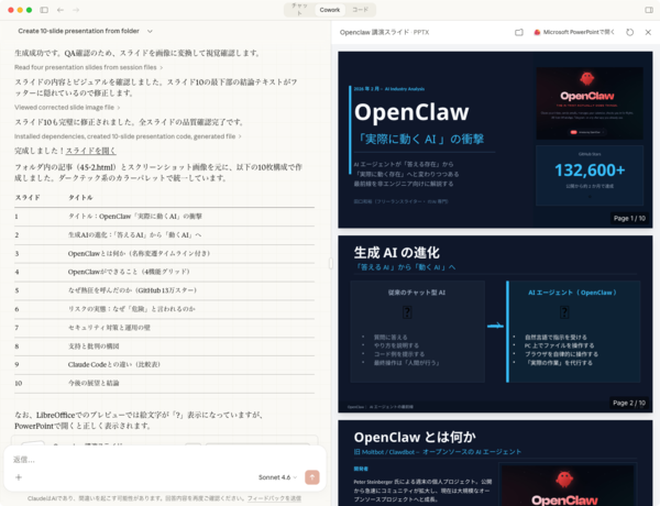 Chatモードでも要約や構成案は作れるが、Coworkではスライドの作成・保存までが自動化されるのがポイントだ。生成内容の論理構造は概ね妥当で、原文の主旨も保持されていた。。