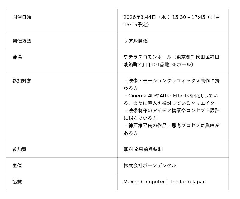 株式会社ボーンデジタル(本社:東京都千代田区、CEO:新 和也、URL:https://www.borndigital.co.jp/ )は、デジタルアーティスト・神戸 雄平氏によるセミナー「【“思考”はどうやって“作品”になるのか】MONO NO AWARE - スノードーム (Official Visualizer) メイキングからひも解く - 神戸雄平 制作思考講座【クリエイティブ構築編】」を、2026年3月4日(水)にワテラスコモンホールにて開催いたします。