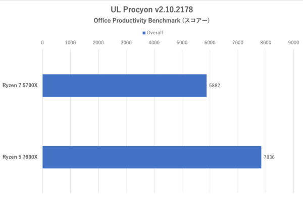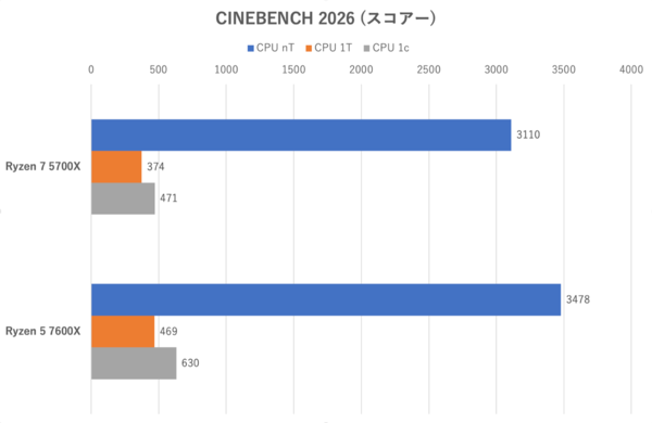 CINEBENCH 2026で優秀だったRyzen 5 7600Xはここでも優秀。少々コアが少なかろうと、DDR5世代のRyzenはDDR4世代のRyzenを性能で上回ってしまうのだ。