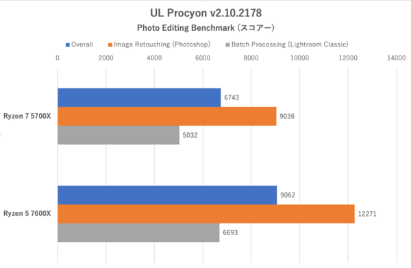 総合スコアーはImage RetouchingとBatch Processingのスコアーを基準に算出されているが、いずれもRyzen 5 7600XがRyzen 7 5700Xに対し3割以上高いスコアーを出している。PhotoshopはCPUコア数よりもシングルスレッド性能の高いCPUが有効だが、前掲のCINEBENCH 2026の1Tあるいは1cテストのスコアーを見ればどちらのCPUが向いているか明らかだ。