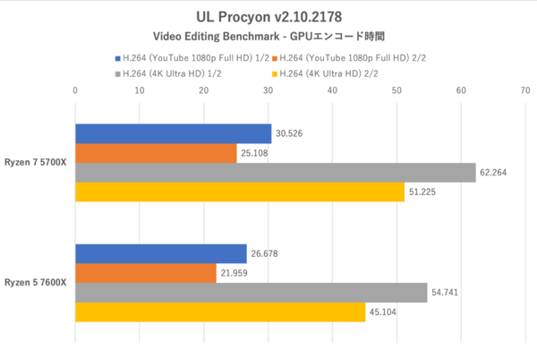 写真編集の次は動画編集、ということでUL Procyonの「Video Editing Benchmark」も試そう。「Premiere Pro 2025」による動画エンコード速度から性能を評価するベンチマークだ。ここでは4本の動画をGPUを利用してエンコードした時の時間を見てみよう。