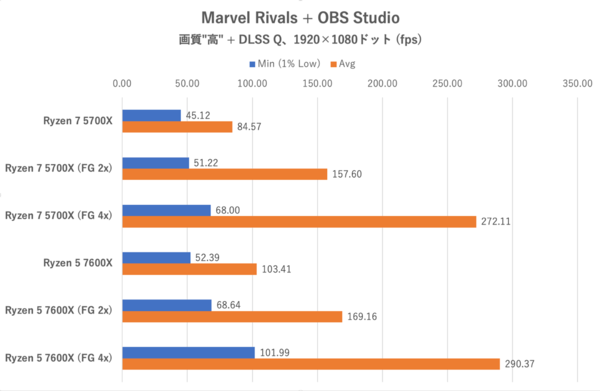 最後に「OBS Studio v32.0.4」でゲーム画面を録画した状態でのパフォーマンスをMarvel Rivals+1920×1080ドット時に限定して検証しておこう。OBS Studioの録画も1920×1080ドット60fps、エンコードにはNVEnc(AV1)を使用している。