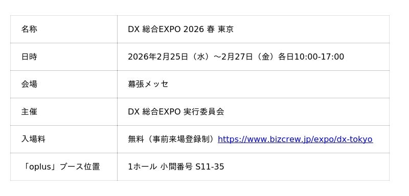 Oplus株式会社(本社:東京都渋谷区、代表取締役:杉原 和樹)が提供するブラウザ・スマホアプリに対応したシフト・勤怠管理DXサービス「oplus(オプラス)」は、2026年2月25日(水)~2月27日(金)にかけて幕張メッセで開催される「DX 総合EXPO 2026 春 東京」に出展いたします。