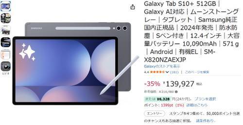 Galaxyの12.4型タブレット「Galaxy Tab S10+ 512GB」が、Amazonで割引対象。参考価格216,480円のところ、35%オフの139,927円で販売中。