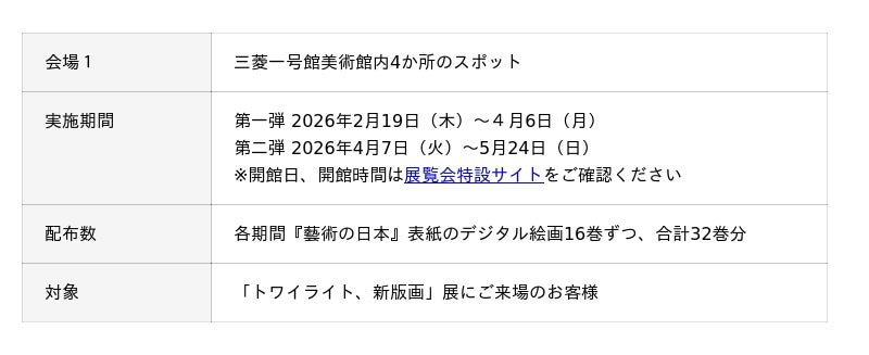 本企画は、2026年2月19日(木)~5月24日(日)の期間、三菱一号館美術館および近隣施設にて実施されます。来場者の方は、同館が所蔵する貴重な美術雑誌『藝術の日本』(19世紀末発行)の全36巻の表紙画像を、デジタル絵画コレクションとして無料で受け取ることができるものです。